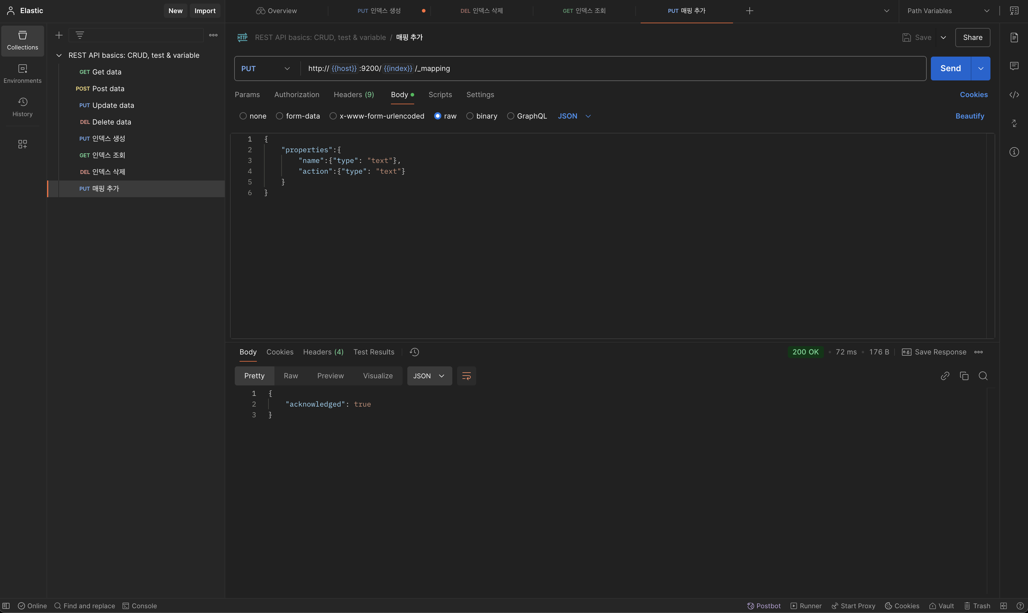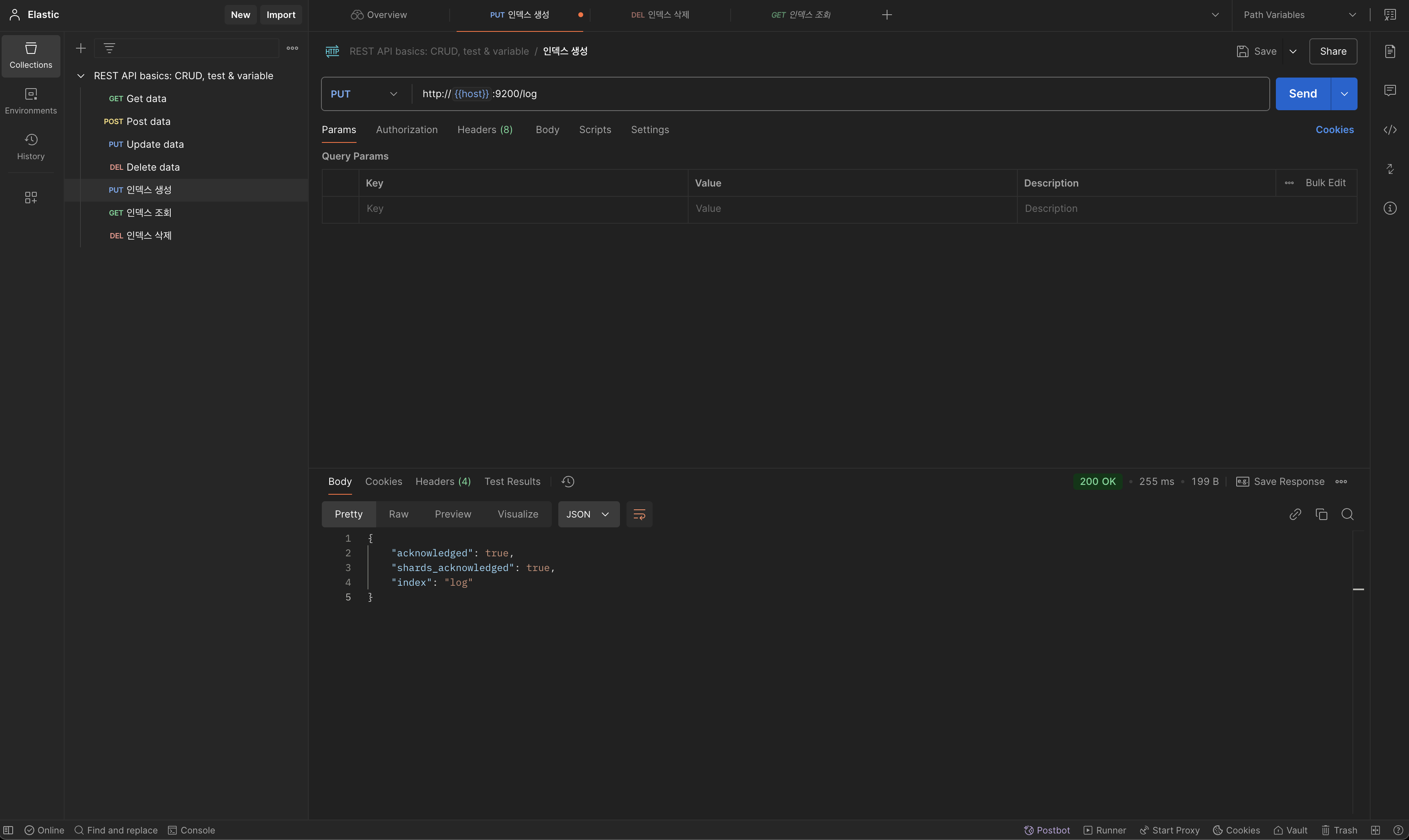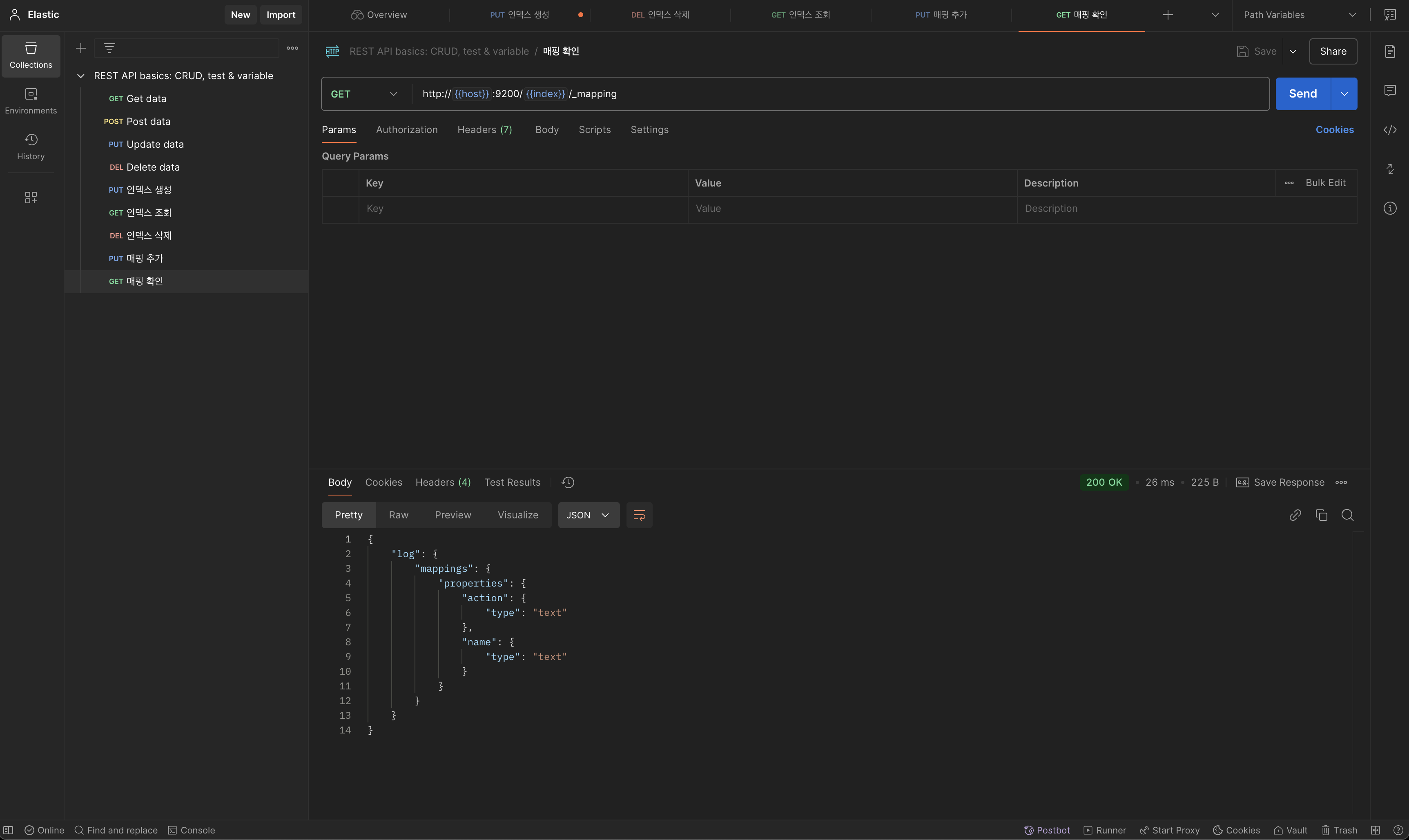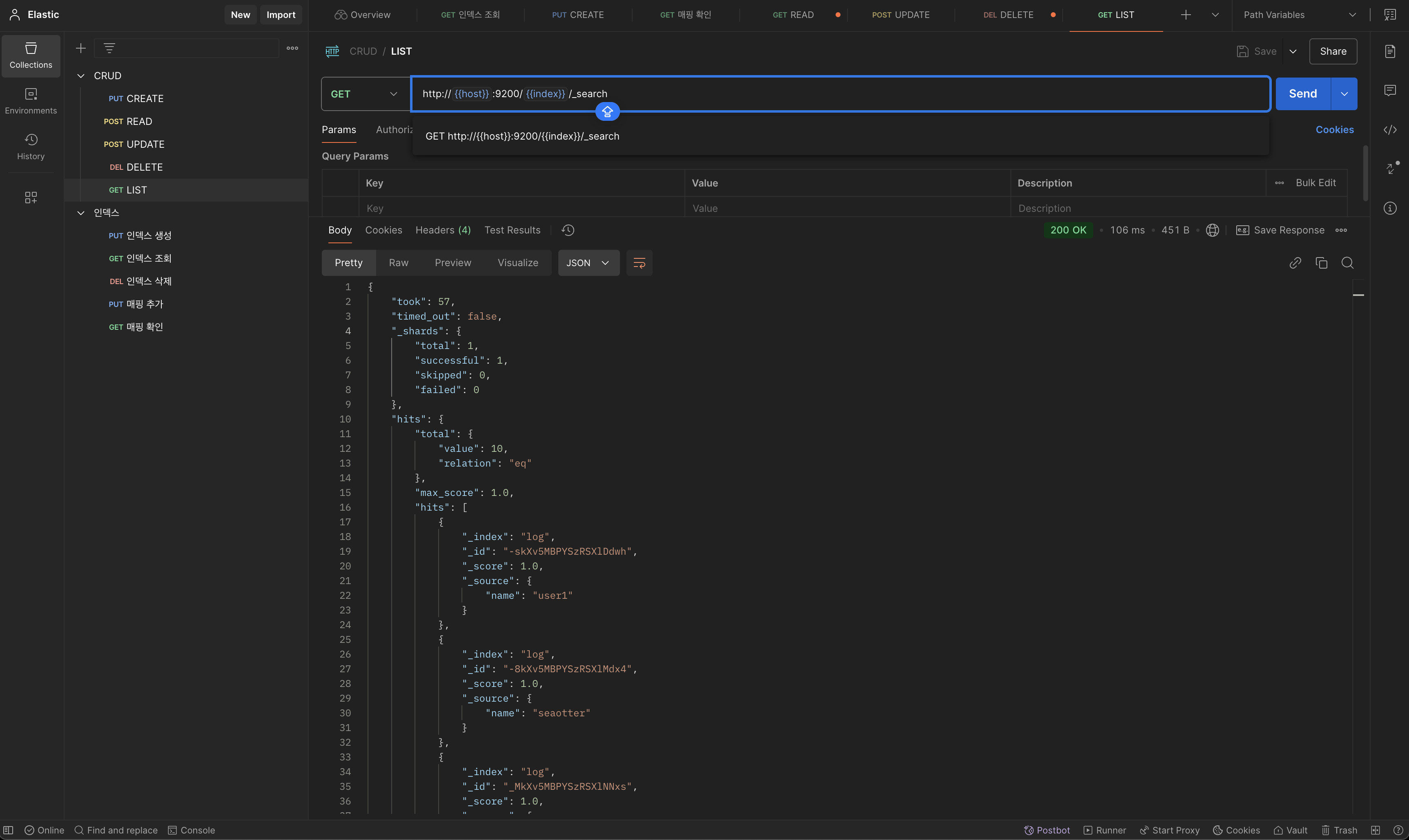 참고로 {{}} 안에 있는 값은 Postman에서 변수로 사용할 수 있는 기능입니다. 예를 들어, 호스트 값을 계속 동일하게 사용해야 하는 경우, Postman의 환경 변수나 글로벌 변수에 host를 등록하면, 모든 요청에서 http://{{host}}:9200과 같이 작성할 수 있습니다. 이렇게 하면 등록된 환경 변수에 따라 {{host}}가 자동으로 치환되어 실제 값(예: http://localhost:9200)으로 대체됩니다.