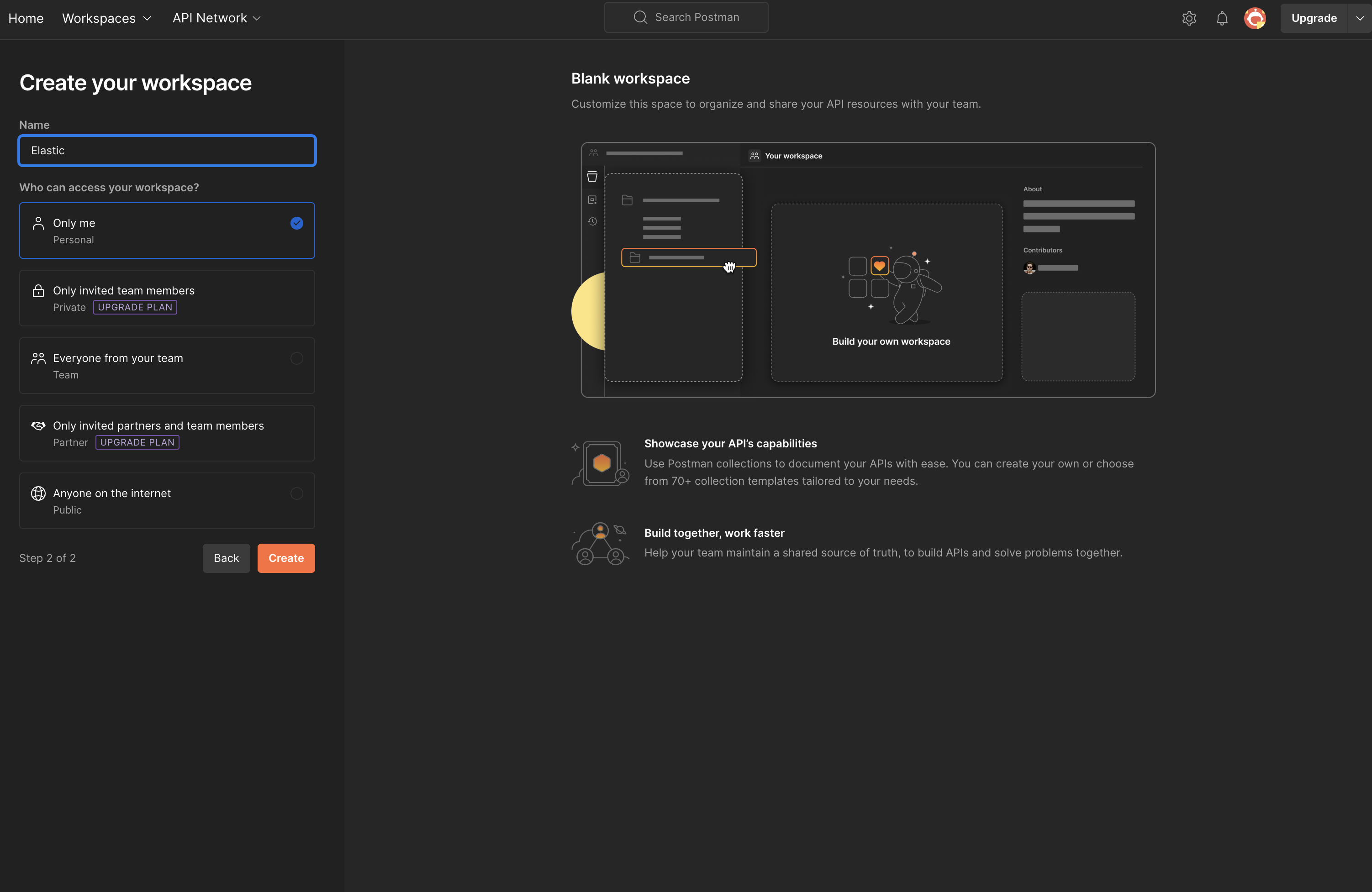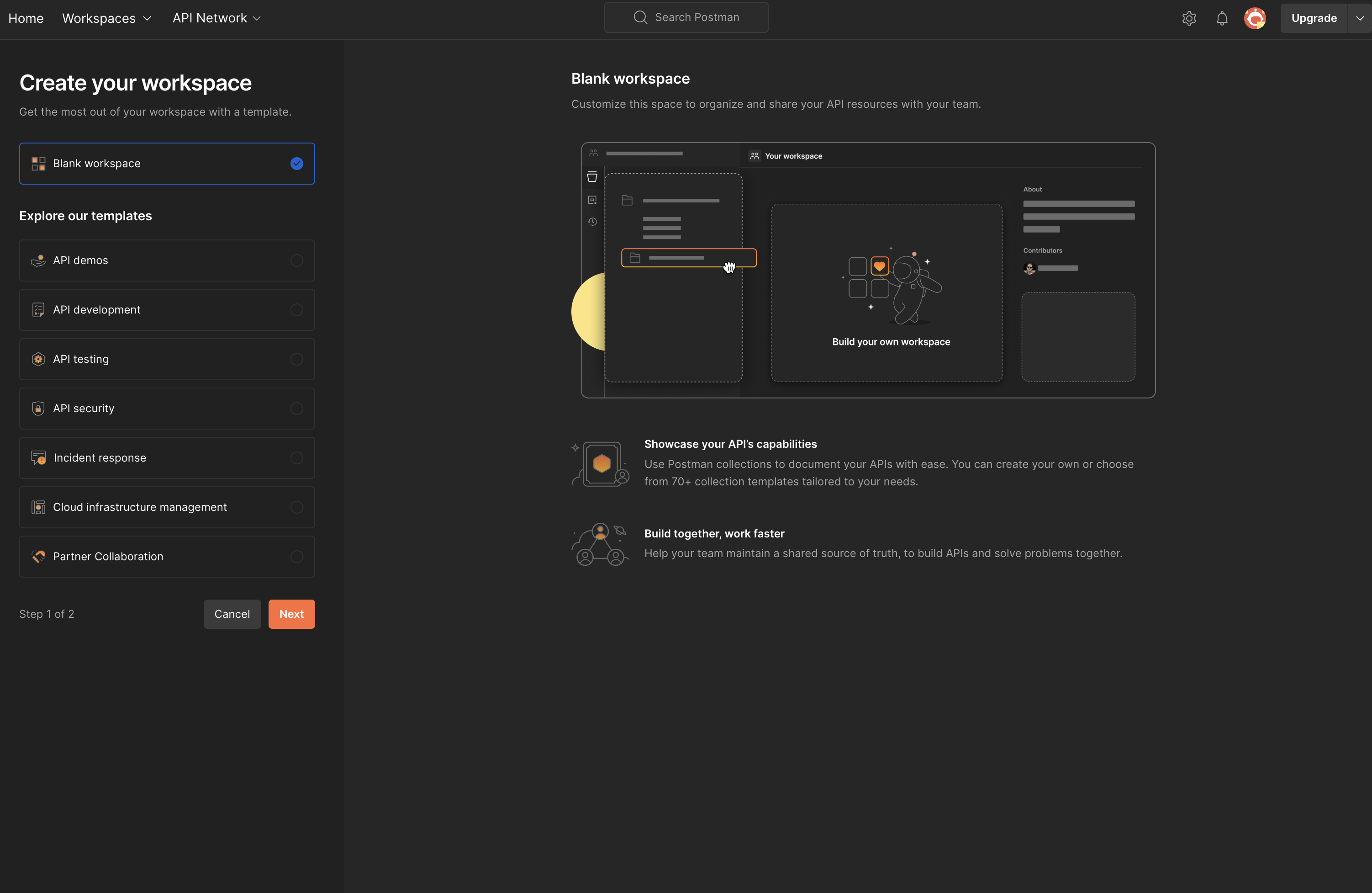 워크스페이스를 생성해줍니다. 템플릿을 추가하면 더 쉽게 사용할 수 있지만 저는 blank로 생성 했습니다.